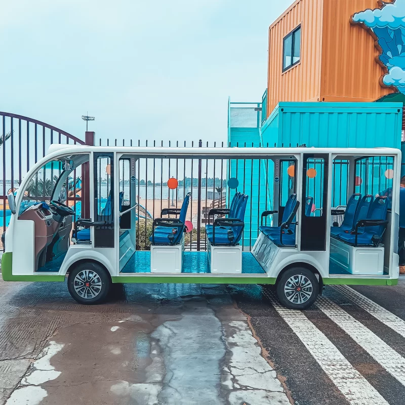 The electric sightseeing bus is a new type of vehicle specially developed for tourist attraction, parks, large communities, schools, hospitals, hotels, large amusement parks, garden hotels, resorts, villas, urban pedestrian streets, airports, ports, docks and other places.